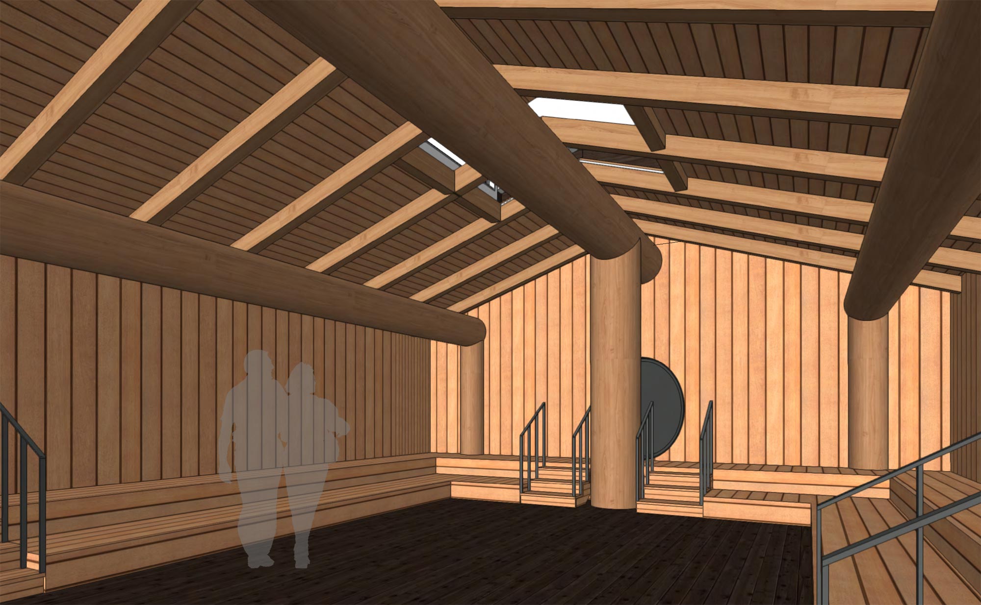 The museum concept was designed to harmonize with the existing Community Center, creating an ensemble of buildings rather than a standalone icon. Approached from the crest of the hill, the vertically striated structure organizes its functions across three levels: a public ground floor, a secure lower level for storage and curatorial work with controlled access, and an upper level for administrative offices offering panoramic views of the site. The material palette mirrors that of the Community Center, reinforcing continuity and cultural identity.